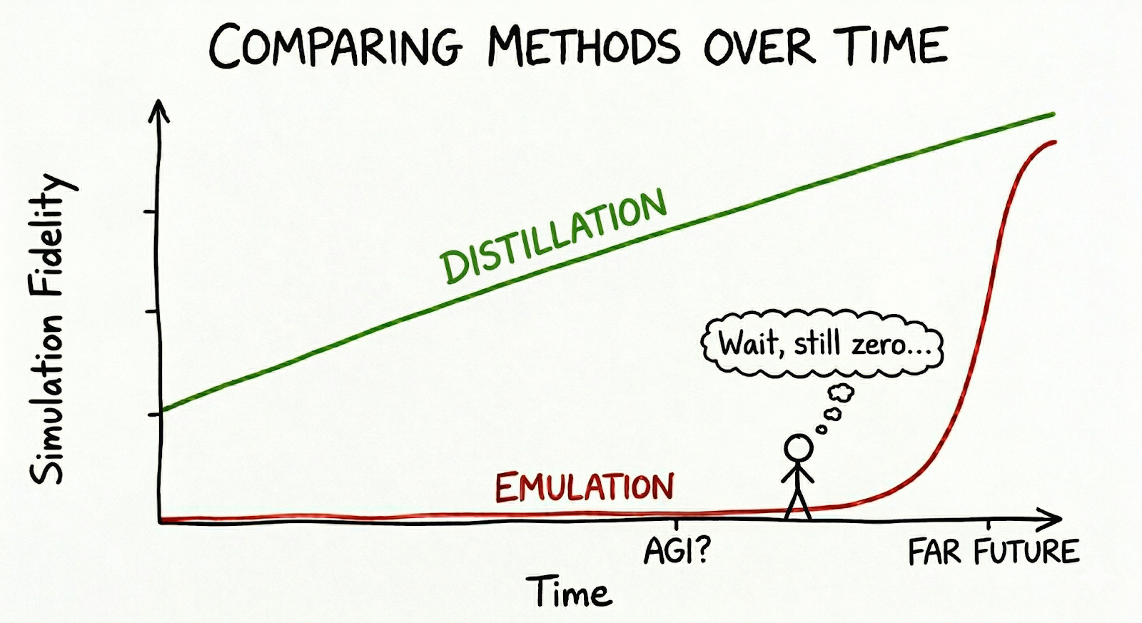 A common objection to a brain-inspired path to AI safety is that neuroscience moves too slowly to keep pace with rapid AI development. However, our work in frontier biology has taught us that you can dramatically increase the speed of discovery by building well-specified virtual models that allow for high-throughput testing of hypotheses. In the context of neuroAI, there are effectively two brain modeling strategies: emulation and distillation. Emulation aims to copy the brain’s precise biological structure, while distillation extracts its underlying rules and algorithms. These two approaches have fundamentally different development trajectories.